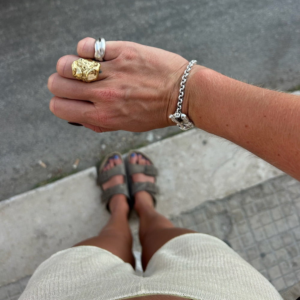 The Gabriel Ring is handcrafted from 100% recycled sterling silver. This molten, chunky ring is designed to be worn everyday but still makes a statement. The perfect pair to go with our Spruce pinkie.